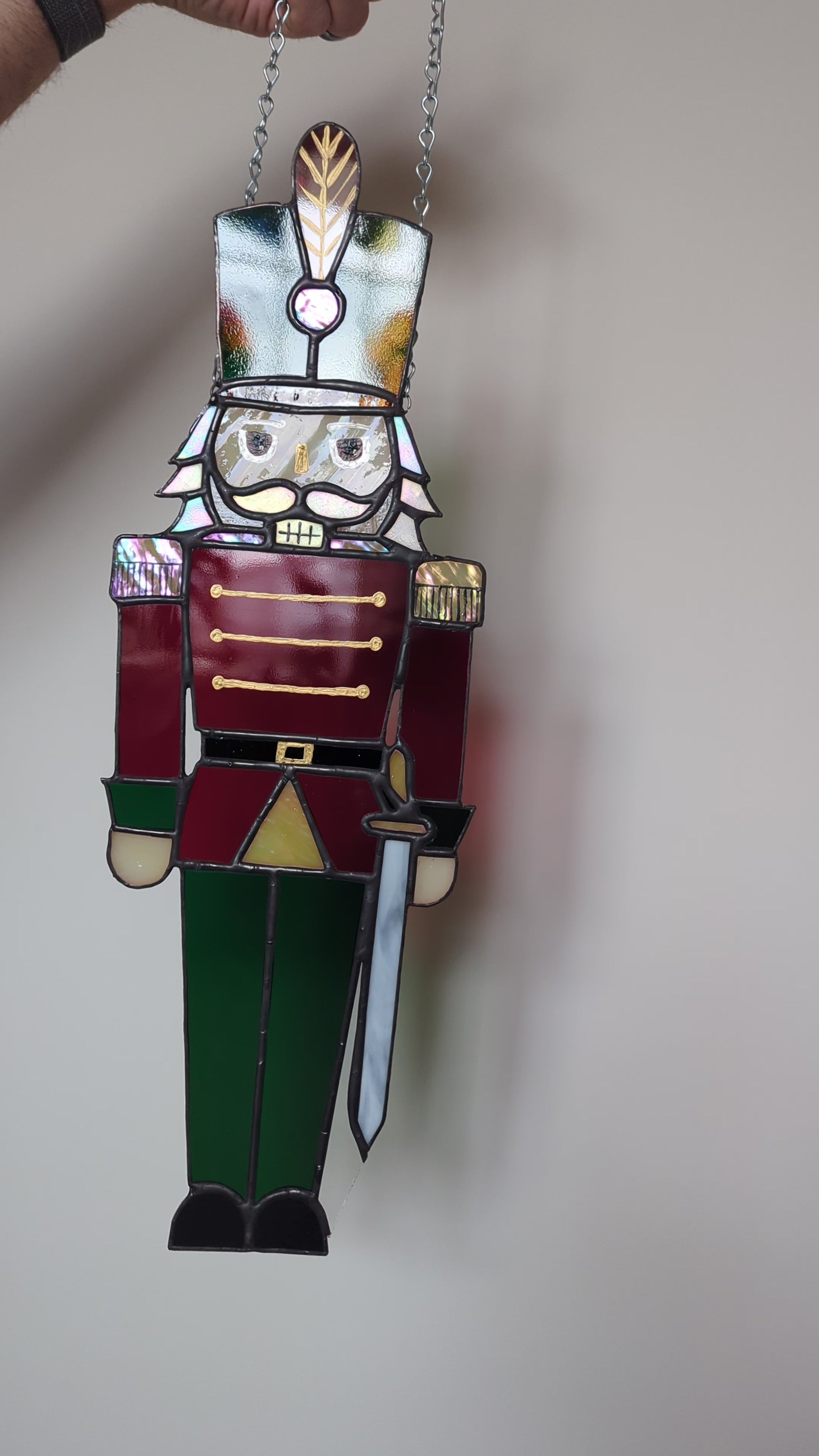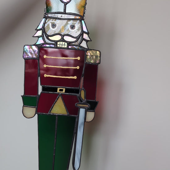 This is a stained glass sun catcher of a nutcracker.