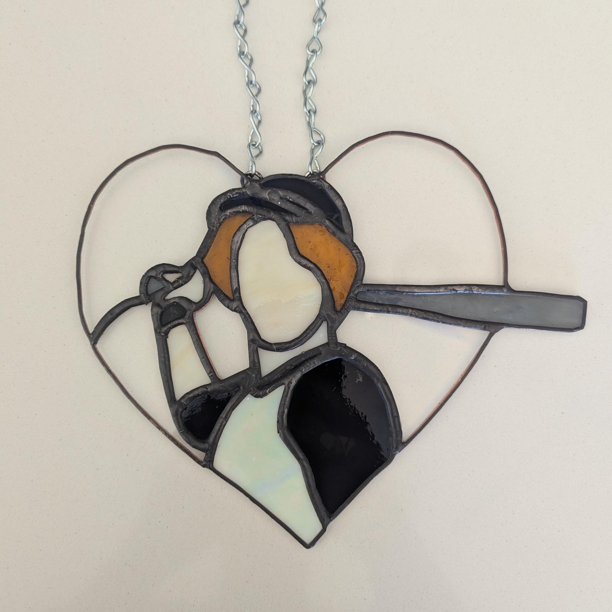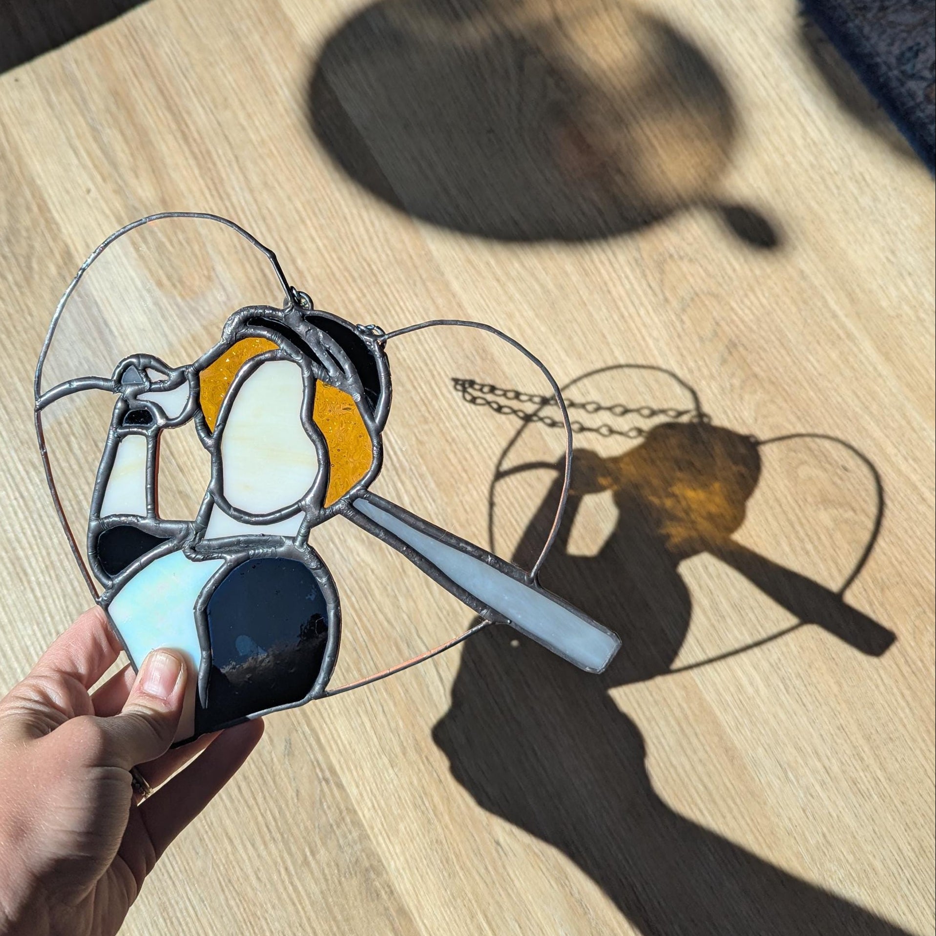 This is a stained glass sun catcher featuring Jasper Hale of the Twilight Series. He is playing baseball, which is an iconic scene out of the first movie in the series.