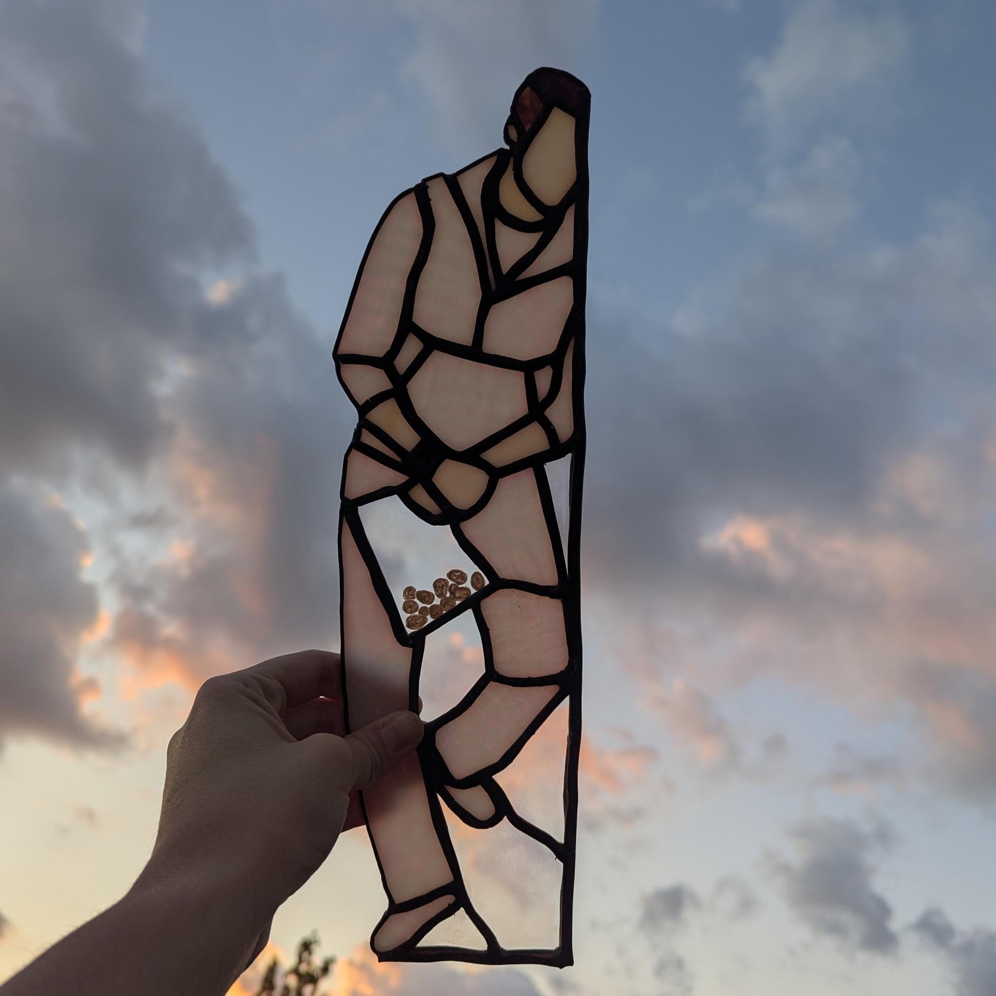 This is a sun catcher featuring Emmett Cullen of the Twilight Series holding a bag of eggs. This sun catcher is designed to sit against a window frame or wall, so it appears as though Emmett is leaning on the window frame.